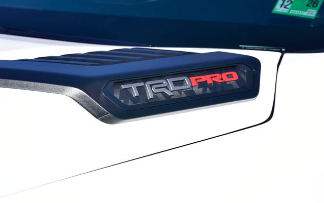 - "TRD PRO" hood badge; black door handles; black window molding and mirror caps; black technical-camo-grained tailgate spoiler and overfenders with marker lights